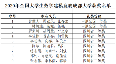 本网消息(文/周敬、施达 图/刘春燕 责编/肖小琼)近日,2020年“高教社杯”全国大学生数学建模竞赛四川赛区获奖名单公布,我校一共15支队伍参赛,9支队伍获奖。其中2支队伍被四川赛区推荐为国家二等奖,2支队伍荣获四川省一等奖,2支队伍荣获四川省二等奖,3支队伍荣获四川省三等奖。