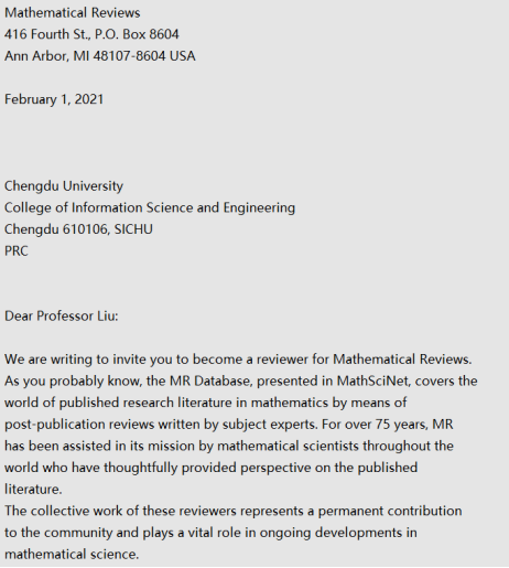 本网消息(文/图/唐超)近期,计算机学院数学基础部刘茹老师收到美国《数学评论》(Mathematical Reviews)执行主编Edward G. Dunne的正式聘请信,应邀担任《数学评论》的评论员(评论员编号:155910)。这是我院教师科研实力、学术影响得到世界高水平刊物认可的体现。