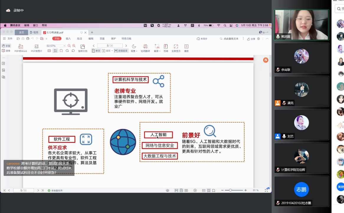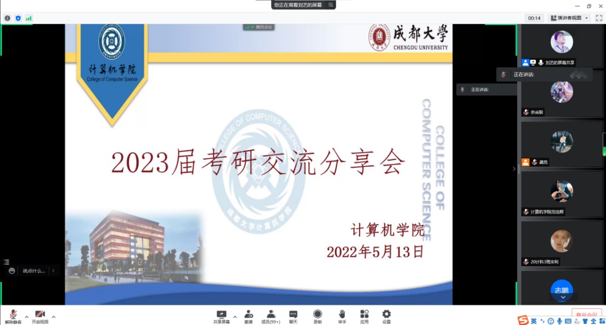 本网消息 (文/图 佘尚联)为提高同学们的考研热情,确立同学们的考研目标,解决考研同学的疑问,激发同学们向学之心,5月13日下午,计算机学院以腾讯会议线上交流的形式开展了2022年考研交流分享会。本次活动特别邀请了2022年成功考取四川大学、云南大学、美国波士顿大学、西南交通大学、西南大学的五位优秀学长和来自中公考研的老师来交流分享,给同学们答疑解惑,分享考研经验、指点迷津。