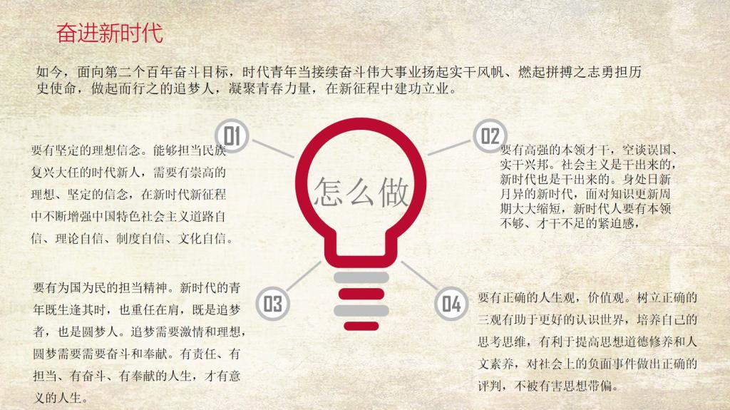 第三项,奋进新征程。面向第二个百年奋斗目标,时代青年当接续奋斗伟大事业扬起实干风帆、燃起拼搏之志勇担历史使命,做起而行之的追梦人,凝聚青春力量,在新征程中建功立业。新时代青年人,要有坚定的理想信念;要有高强的本领才干,空谈误国、实干兴邦;要有为国为民的担当精神;要有正确的人生观、价值观。