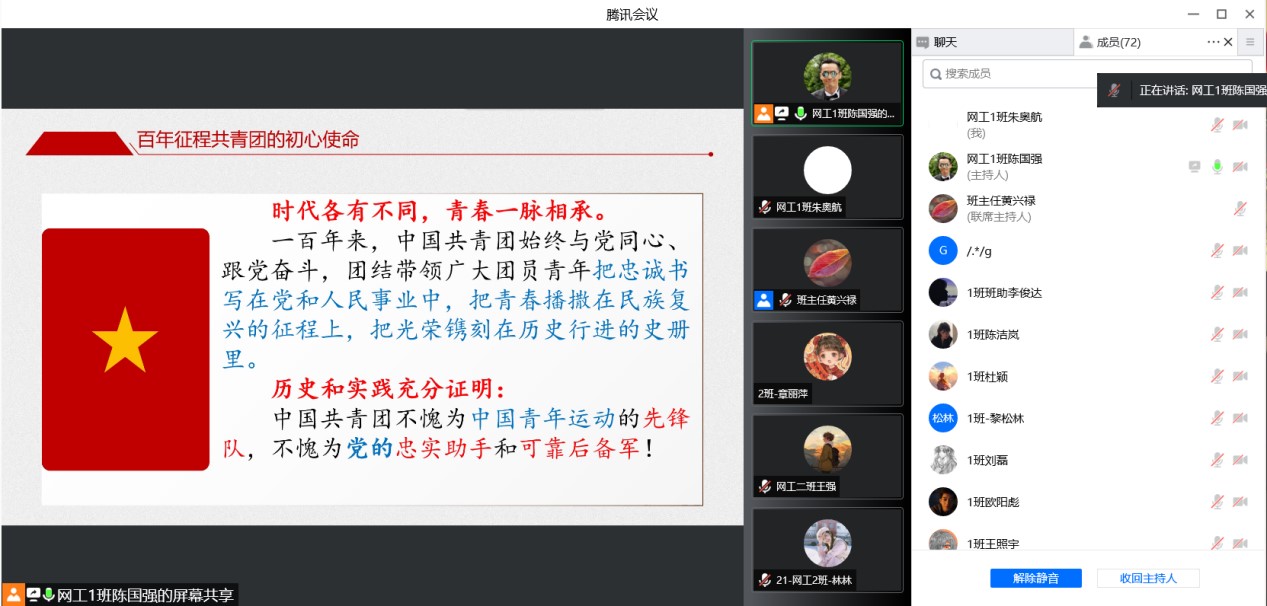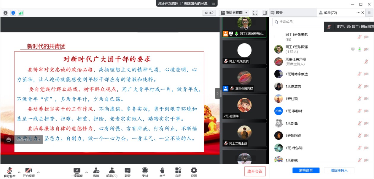 本网消息(文/图 余美儿)5月17日,2021级软件工程专业在线上举办以 “学习习近平总书记在庆祝中国共产主义青年团成立100周年大会上讲话”主题教育活动。为学习和贯彻习近平总书记再庆祝中国共产主义青年团成立100周年大会上的讲话精神,引导同学们深入践行“青春向党,不负韶华”的精神面貌,2021级网络工程专业12班举行主题教育班会。班长陈国强同学主持会议,网工12班全体同学、班主任及班助参加。