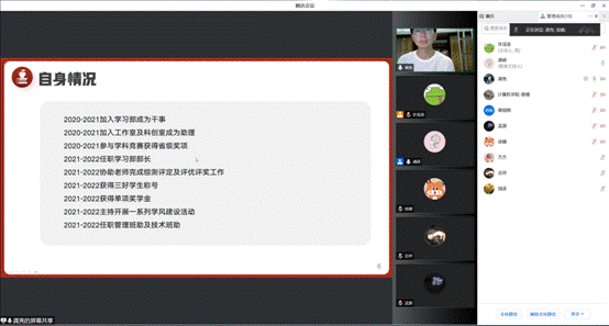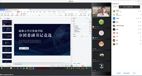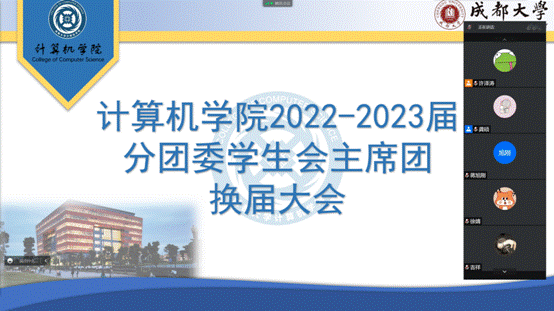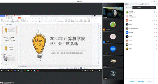 本网消息(文/裴启艳 /许泽涛)为学院分团委学生会主席团注入新鲜血液,给大家提供锻炼的机会和平台。202276日(星期三)下午两点半,计算机学院以腾讯会议的方式开展2022-2023届分团委学生会主席团换届大会。本次大会的参与人员有学院党委副书记孟源、学工办老师曾倩、饶涛以及参加竞选的三位学生干部蒋旭刚、龚亮、徐婧,学院分团委书记龚硕参加并主持大会。